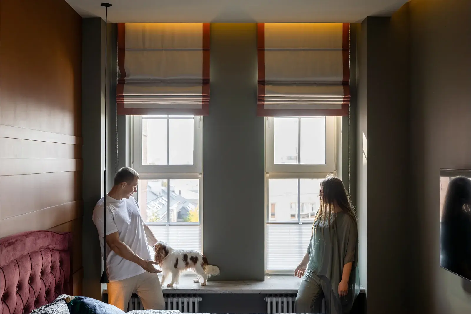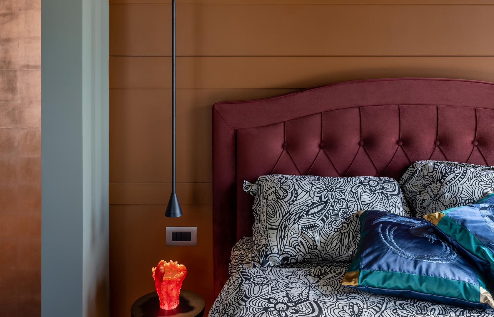 Мастер-спальня — это территория глубоких ощущений. Цветовая палитра здесь смелее и сложнее: терракотовые стены в сочетании с винным оттенком мягкого изголовья кровати создают атмосферу дорогого бутик-отеля. Здесь не хочется спешить. Тактильный текстиль, приглушенный свет и продуманная гардеробная превращают утренние сборы в приятный ритуал. Наличие собственного санузла при спальне окончательно отделяет личное от общего, оставляя гостевой санузел для визитов друзей.