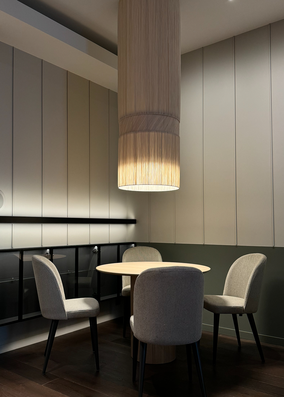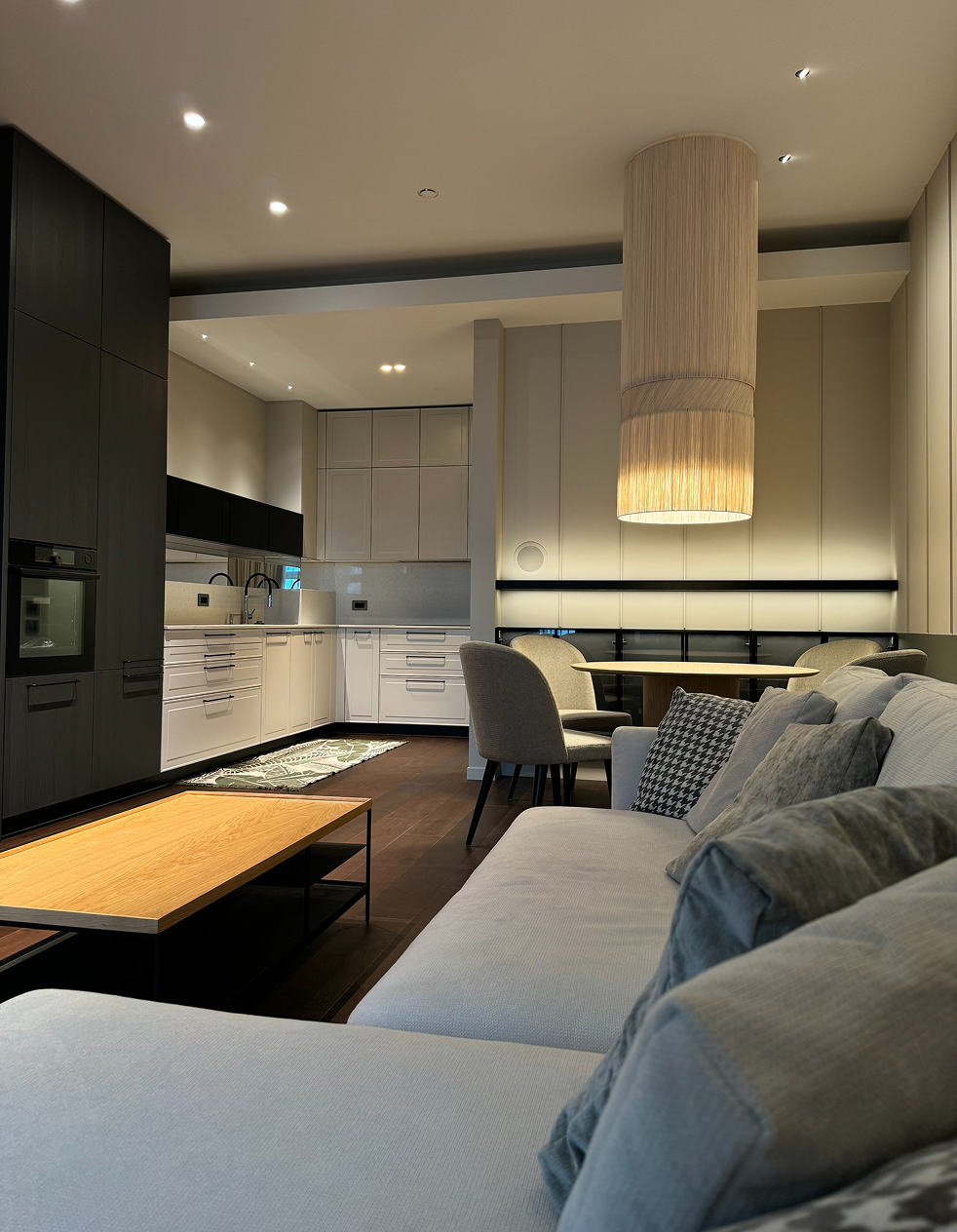 Вечером центр притяжения смещается к столовой зоне. Огромный текстильный абажур-гигант мягко рассеивает свет, создавая интимный круг над деревянным столом. Это идеальное место для долгих ужинов, которые плавно перетекают в просмотр кино. Система домашнего кинотеатра превращает гостиную в приватный зал, где техническое совершенство скрыто за выверенной эстетикой.